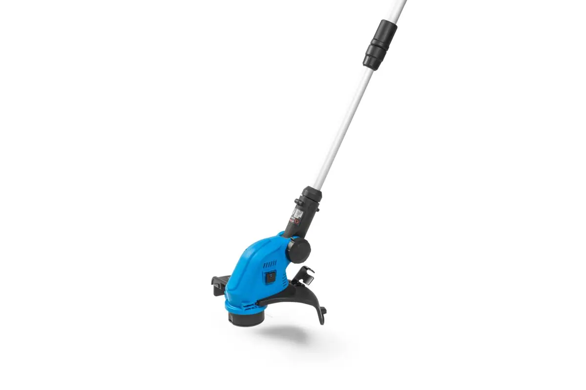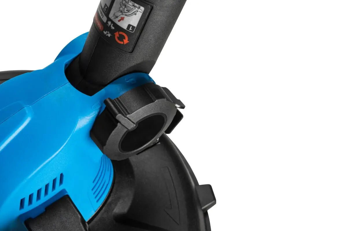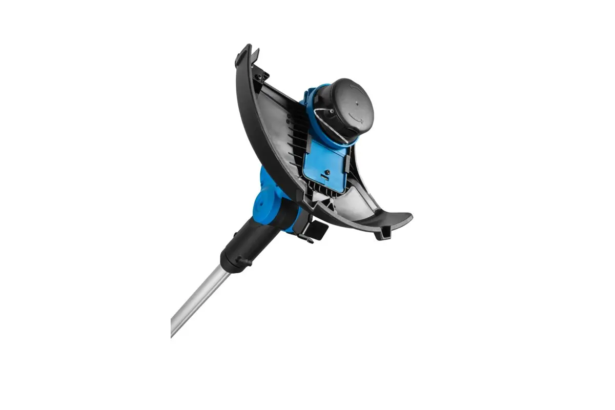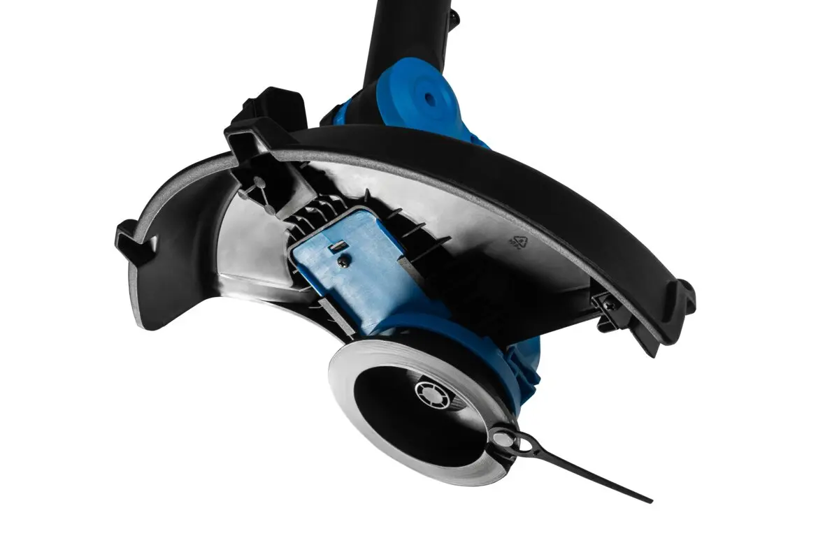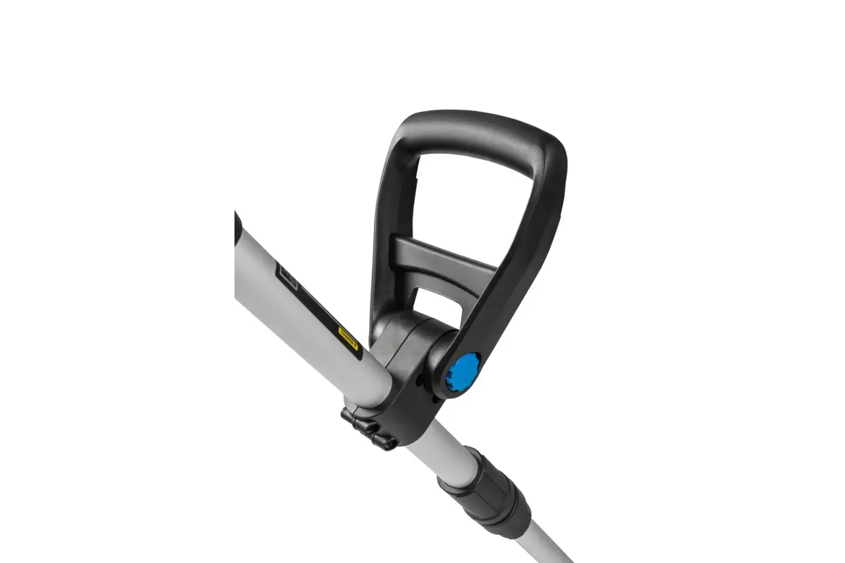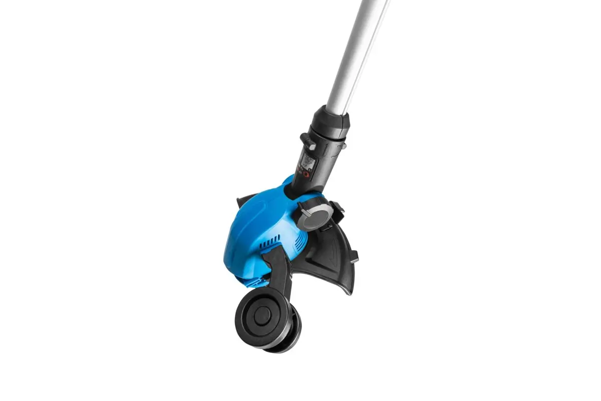 Regulowana długość uchwytu umożliwia dopasowanie narzędzia do wzrostu użytkownika, a regulowany kąt nachylenia głowicy ułatwia koszenie w trudno dostępnych miejscach, np. pod ławkami czy krzewami. Kółko boczne przeznaczone do krawędziowania pozwala na równe i estetyczne przycinanie krawędzi trawnika wzdłuż chodników i obrzeży, bez konieczności unoszenia narzędzia.