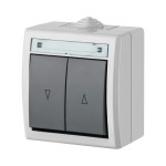 Wyłącznik żaluzjowy w kolorze szarym firmy Elektro-Plast Nasielsk. Hermetyczny łącznik nadaje się do stosowania na zewnątrz, dodatkowo posiadaja podwyższoną odporność na promienie UV. Został on wykonany w technologii wtrysku dwukomponentowego 2K, który gwarantuje uszczelnienie. Łącznik został również wyposażony w przesłony torów prądowych. Swoje zastosowanie znajdzie w halach garażowych, pralniach, magazynach czy pomieszczeniach gastronomicznych. Wyłącznik pochodzi z serii Aquant, która jest serią natynkową. Materiały, z których został wyproduktowany osprzęt elektroinstalacyjny tej serii gwarantują odporność na wodę i pył dzięki wysokiemu stopniu ochrony - IP55.