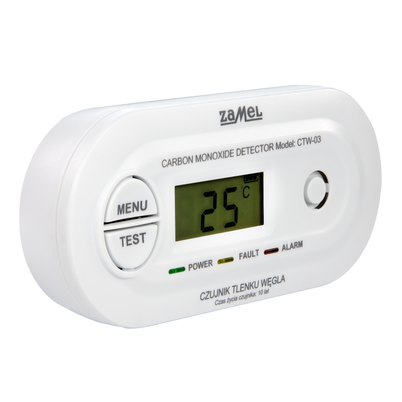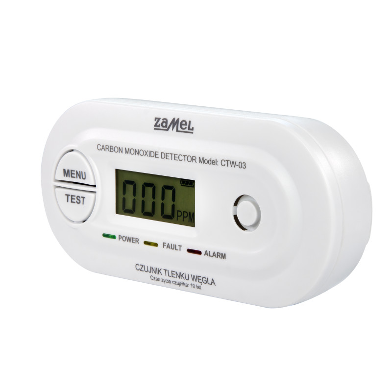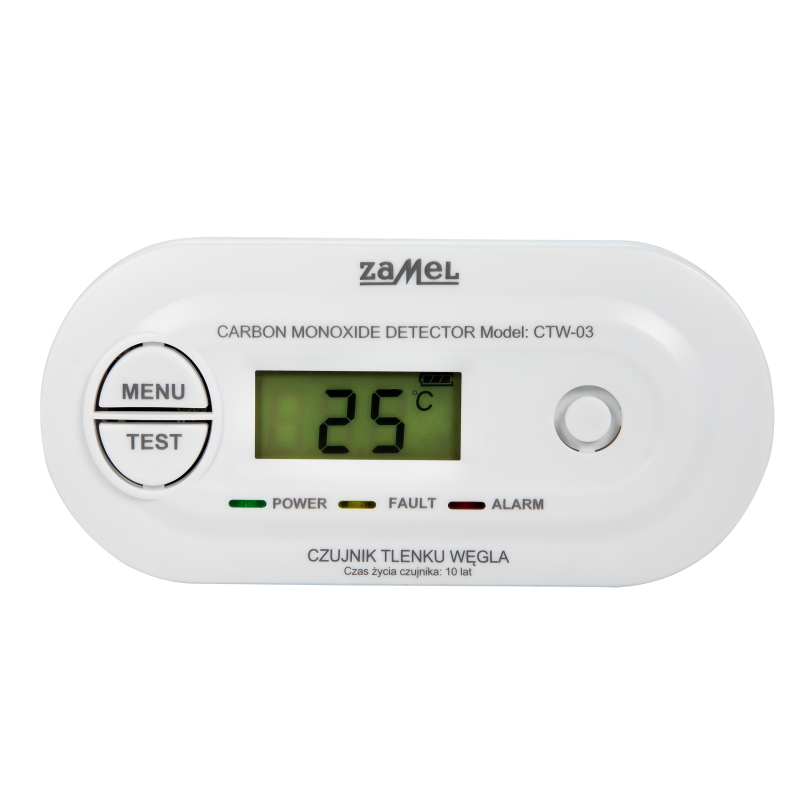 Czujnik CTW-03 służy do ciągłego monitorowania niebezpiecznego stężenia tlenku węgla w powietrzu. W momencie wykrycia niebezpiecznego stężenia urządzenie załącza alarm dźwiękowy i optyczny. Dzięki zasilaniu bateryjnemu urządzenie jest łatwe do umieszczenia w dowolnym miejscu gdyż nie musimy prowadzić żadnej instalacji. Wyposażony jest w zaawansowany czujnik elektrochemiczny o żywotności 10lat oraz w układ autodiagnostyczny który sygnalizuje uszkodzenie czujnika oraz rozładowującą się baterię. Wyposażony jest dodatkowo w wyświetlacz LCD pokazujący stężenie tlenku węgla oraz komunikaty informacyjne. Posiada także dodatkowe funkcje takie jak pamięć zarejestrowanych stężeń gazu oraz pomiar temperatury.
