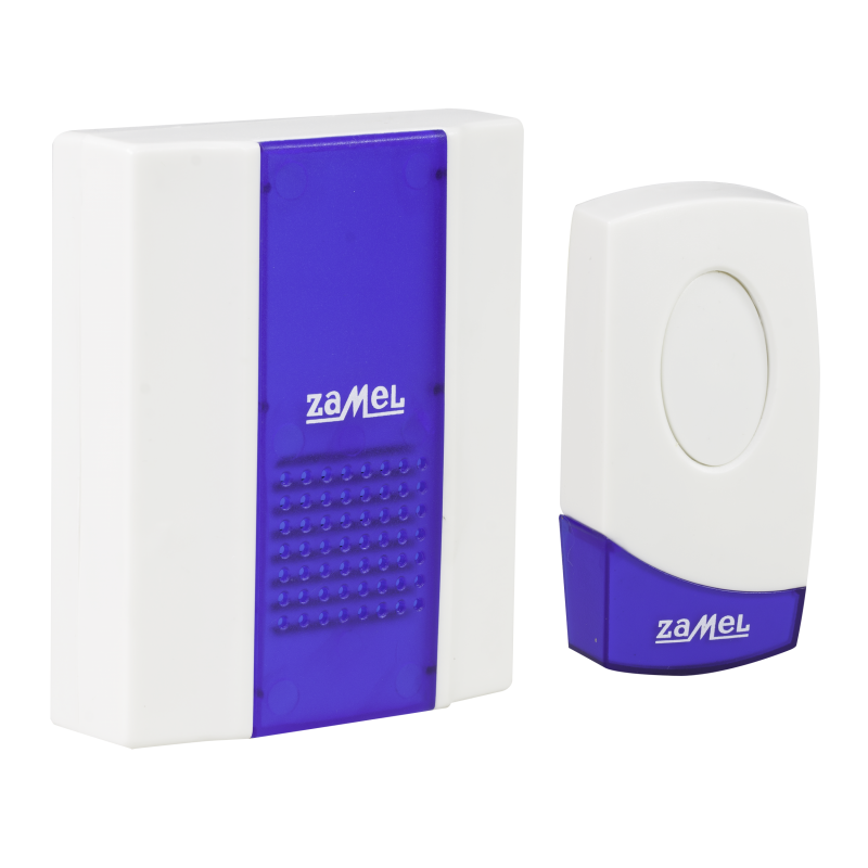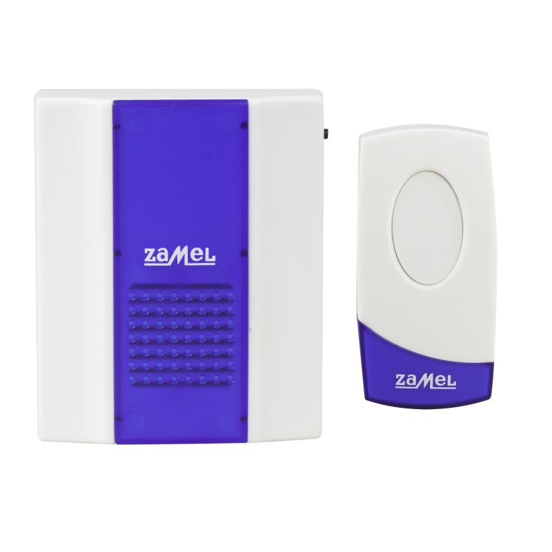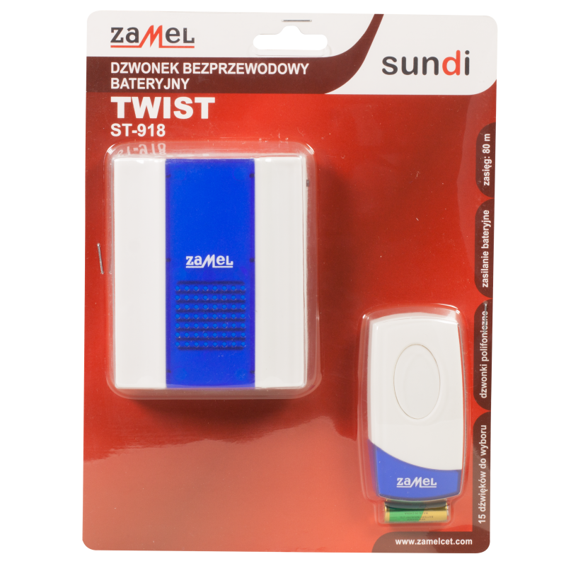 Bezprzewodowy bateryjny dzwonek o zasięgu 80 metrów w kolorze biało-niebieskim firmy Zamel. Jest doskonałym rozwiązaniem dla gospodarstw domowych, mieszkań, restauracji czy hoteli. Dzwonek sprawdzi się także jako wewnętrzne urządzenie przywoławcze oraz jako dzwonek barowy w barze czy hotelu. Urządzenie nie wymaga instalacji dzwonkowej. W skład zestawu ST-918 wchodzi dzwonek oraz przycisk bezprzewodowy.