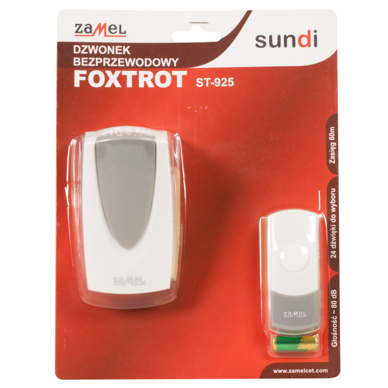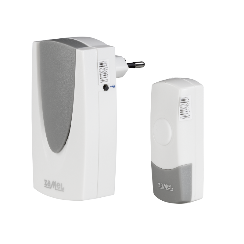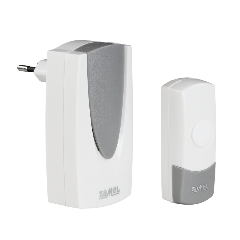 Bezprzewodowy dzwonek o zasięgu 60 metrów w kolorze biało-szarym firmy Zamel. Doskonale sprawdzi się jako dzwonek do drzwi czy wewnętrzne urządzenie przywoławcze. Nie wymaga instalacji dzwonkowej, dzownek jest włączany bezpośrednio do gniazda sieci 230V. W skład zestawu ST-925 wchodzi bezprzewodowy dzwonek Foxtrot oraz przycisk dzwonkowy bezprzewodowy.