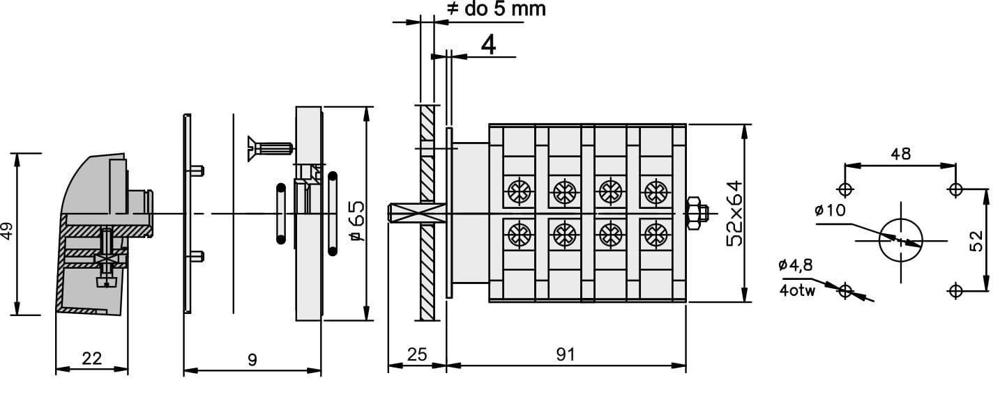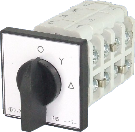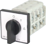 Zatablicowy wyłącznik krzywkowy (gwiazda trójkąt) z płytką przednią firmy Elektromet. Wyłącznik krzywkowy jest odmianą łącznika warstwowego. Sposób łączenia łącznika to O-Y-A (gwiazda trójkąt).
