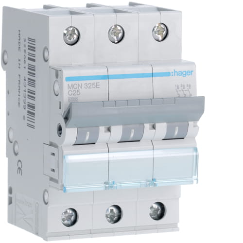 3-biegunowy wyłącznik nadprądowy o prądzie znamionowym 25A firmy Hager. Wyłącznik nadprądowy ochrania kable i przewody przed skutkami przeciążeń oraz zwarć w instalacji elektrycznej. Jest to jeden z głównych elementów instalacji elektrycznej. W przypadku gdy prąd przekroczy wartość bezpieczną dla obwodu, wyłącznik przerywa jego ciągłość. Wyłącznik nadprądowy z charakterystyką wyzwalania typu C charakteryzuje się opóźnionym działaniem i jest przeznaczony do ochrony instalacji zasilających o niewielkich mocach - do kilku kilowatów.