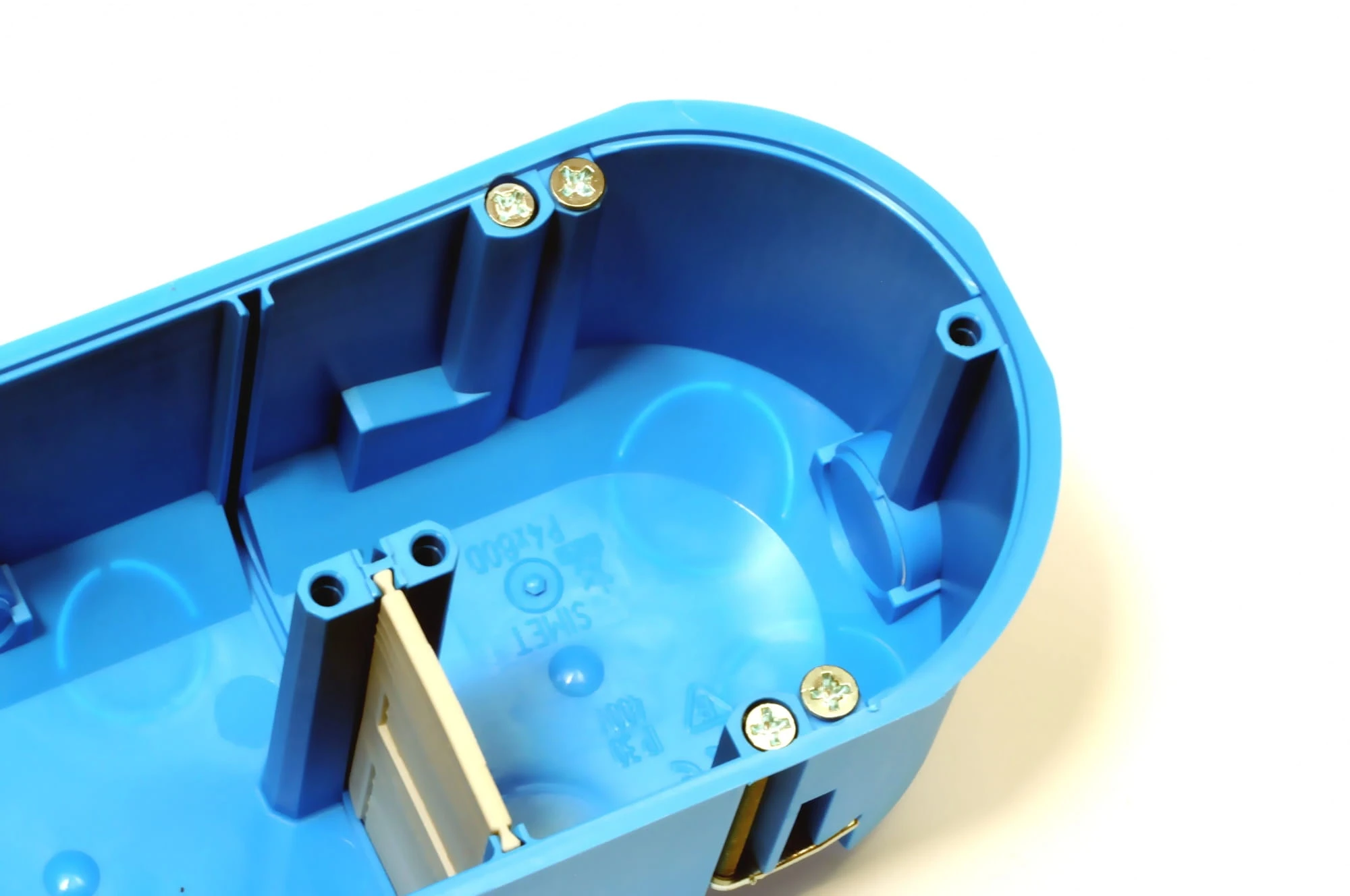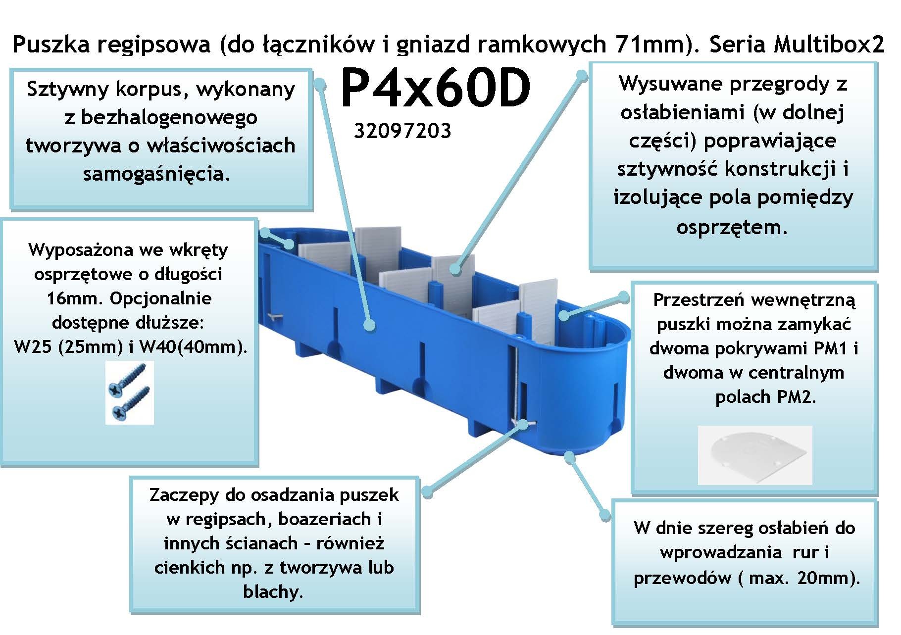 Głęboka czteropolowa puszka instalacyjna do pustych ścian 4x60mm w kolorze niebieskim firmy Simet. Puszka regipsowa do łączników i gniazd ramkowych 71 mm, pochodzi z serii Multibox2. Posiada sztywny korpus, wykonany z bezhalogenowego tworzywa o właściwościach samogaśnięcia. Puszka została wyposażona w wysuwane przegrody z osłabieniami poprawiające sztywność konstrukcji i izolujące pola między osprzętem. Wewnętrzną przestrzeń puszki można zamykać dwoma pokrywami PM1 i dwoma w centralnych polach PM2. Puszka posiada wbudowane zaczepy, które pozwalają na osadzenie puszki w regipsach, boazeriach i innych ścianach - również cienkich np. z tworzywa lub blachy.