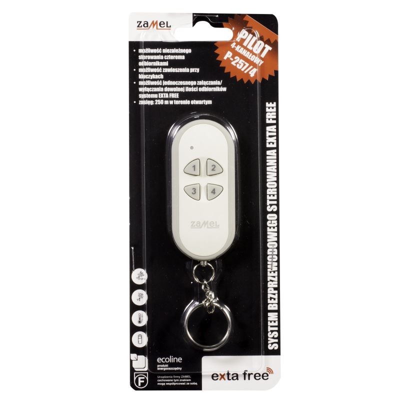 4-kanałowy pilot firmy Zamel. Służy do sterowania odbiornikami systemu Exta Free. Pilot jest urządzeniem nadawczym przeznaczonym do realizacji funkcji sterowania, takich jak: włączanie/wyłączanie, rozjaśnianie/ściemnianie, podnoszenie/opuszczanie rolet. Urządzenie pozwala na proste sterowanie roletami, napędami bram czy oświetleniem. Używanie pilota jest bardzo wygodne dzięki ergonomicznemu kształtowi oraz niewielkim rozmiarom i idealnie sprawdzi się w codziennym użytku.