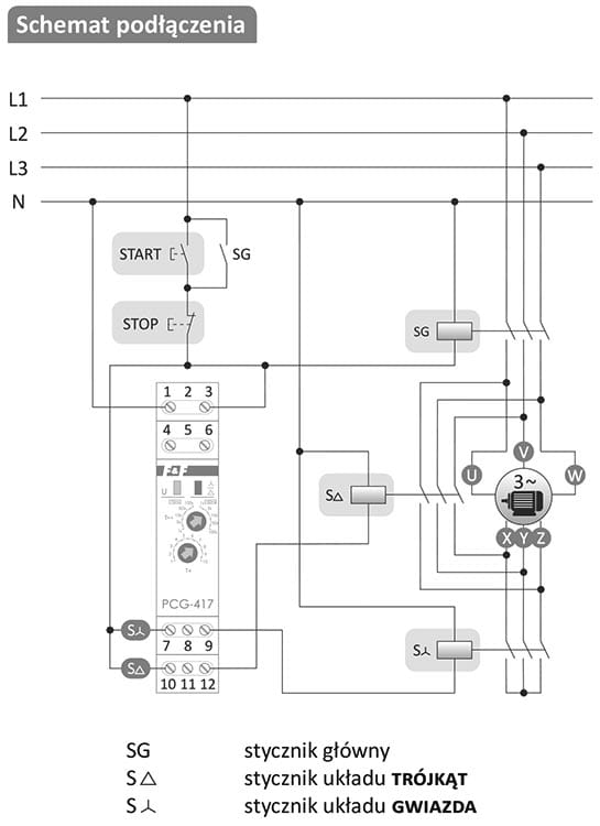 Sterownik czasowy PCG-417 DUO posiada specjalny układ dwóch przekaźników elektromagnetycznych, który eliminuje ryzyko załączenia dwóch styczników jednocześnie. Każdy z przekaźników steruje odpowiednim stycznikiem. W chwili przełączenia z układu "gwiazda" na "trójkąt", pierwszy rozłącza stycznik „gwiazdy”, następuje wymuszona przerwa czasowa, a następnie drugi przekaźnik załącza stycznik „trójkąta”. Po załączeniu zasilania styk "gwiazdy" zostanie przełączony w pozycję 7-9 na ustawiony czas rozruchu t1. Styk „trójkąta” pozostaje w pozycji 10-11. Po upływie czasu rozruchu t1 styk "gwiazdy" zostanie przełączony w pozycję 7-8 (styk „trójkąta” nadal pozostaje w pozycji 10-11) i nastąpi przerwa przełączenia o ustawionym czasie t2. Po upływie czasu t2 styk „trójkąta” zostanie przełączony w pozycję 10-12 i pozostaje w tym stanie do momentu odłączenia napięcia zasilającego (styk "gwiazdy" pozostaje w pozycji 7-8).