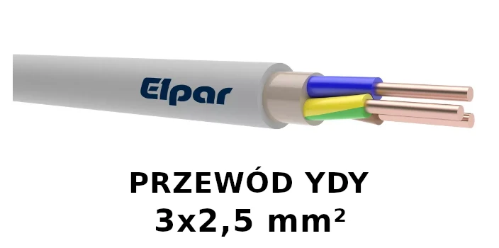 Okrągły przewód instalacyjny YDY 3x2,5 mm² z żyłą ochronną firmy Elpar. Przewód o miedzianych żyłach jednodrutowych (D) w izolacji z polwinitowej (Y) i w powłoce polwinitowej (Y) z żyłą ochronną żółto-zieloną (żo). Przewody przeznaczone są do układania na stałe, do pracy w otoczeniu o temperaturze od -40°C do +70°C i wilgotności względnej do 100% oraz do układania na stałe w urządzeniach elektroenergetycznych.