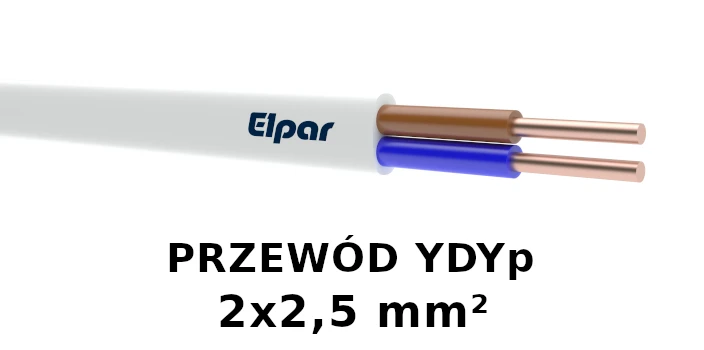 Płaski przewód instalacyjny YDYp 2x2,5 mm² firmy Elpar. Przewód o miedzianych żyłach jednodrutowych (D) w izolacji z polwinitowej (Y) i w powłoce polwinitowej (Y) płaski (p). Przewody przeznaczone są do układania na stałe, do pracy w otoczeniu o temperaturze od -40°C do +70°C i wilgotności względnej do 100% oraz do układania na stałe w urządzeniach elektroenergetycznych.
