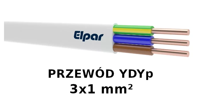 Płaski przewód instalacyjny YDYp 3x1 mm² z żyłą ochronną firmy Elpar. Przewód o miedzianych żyłach jednodrutowych (D) w izolacji z polwinitowej (Y) i w powłoce polwinitowej (Y) płaski (p) z żyłą ochronną żółto-zieloną (żo). Przewody przeznaczone są do układania na stałe, do pracy w otoczeniu o temperaturze od -40°C do +70°C i wilgotności względnej do 100% oraz do układania na stałe w urządzeniach elektroenergetycznych.