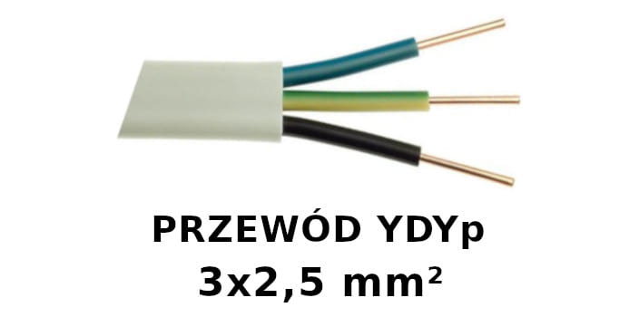 Płaski przewód instalacyjny YDYp 3x2,5 mm². Kabel YDYp jest przewodem o miedzianych żyłach, jednodrutowych oraz izolacji z polwinitu zwykłego i powłoce polwinitowej płaski. Przewód elektroenergetyczny do układania na stałe, z żyłami miedzianymi jednodrutowymi o izolacji i powłoce polwinitowej, płaski, z zielono-żółtą żyłą ochronną. Kabel jest przeznaczony do układania na stałe w urządzeniach elektroenergetycznych, instalacjach przemysłowych i domowych, w suchych pomieszczeniach i wilgotnych na tynku i pod tynkiem. Przewód może być także używany na zewnątrz, ale musi być chroniony przed bezpośrednim działaniem słońca.