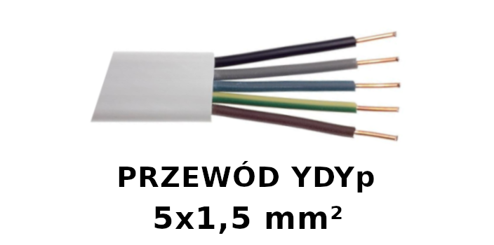 Płaski przewód instalacyjny YDYp 5x1,5 mm². Kabel YDYp jest przewodem o miedzianych żyłach, jednodrutowych o izolacji i powłoce z polwinitu, płaskie, ogólnego przeznaczenia do układania na stałe. Przewód płaski do układania na stałe w urządzeniach elektroenergetycznych pracujących w środowisku suchym i wilgotnym, do układania pod tynkiem i na tynku.