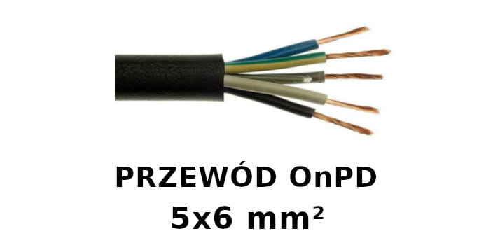 Oponowy przewód przemysłowy 5x6 mm². Kabel linka (OPD) jest stosowany do przenośnych oraz ruchomych odbiorników o dużym poborze mocy używanych w przemyśle i rolnictwie. Posiada bardzo dużą odporność na zgięcia, odkształcenia i przetarcia. Izolacja przewodu jest gumowa, a opona wzmocniona z gumy trudnopalnej i olejoodpornej.