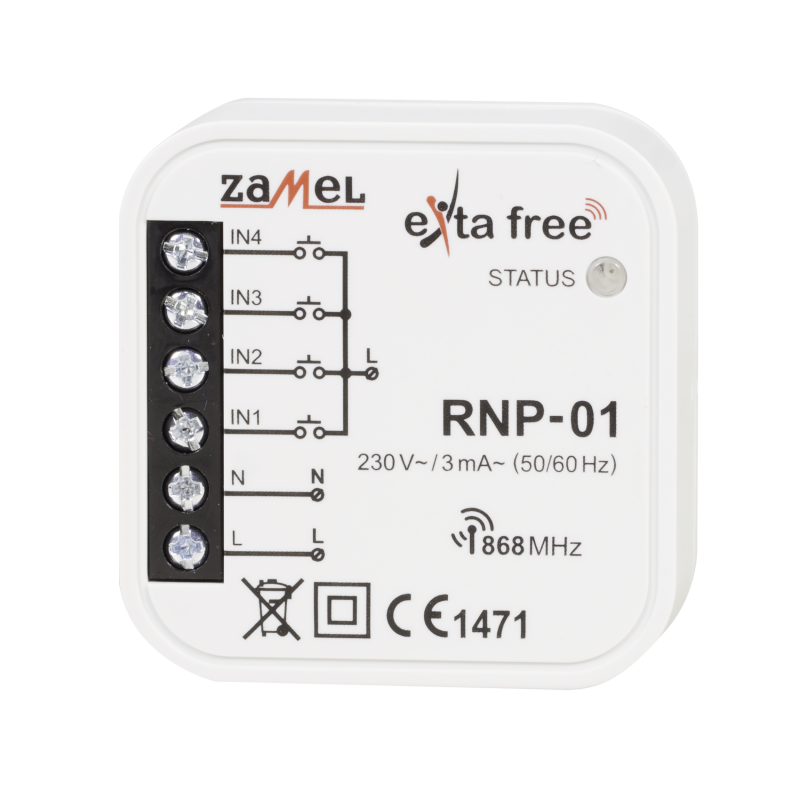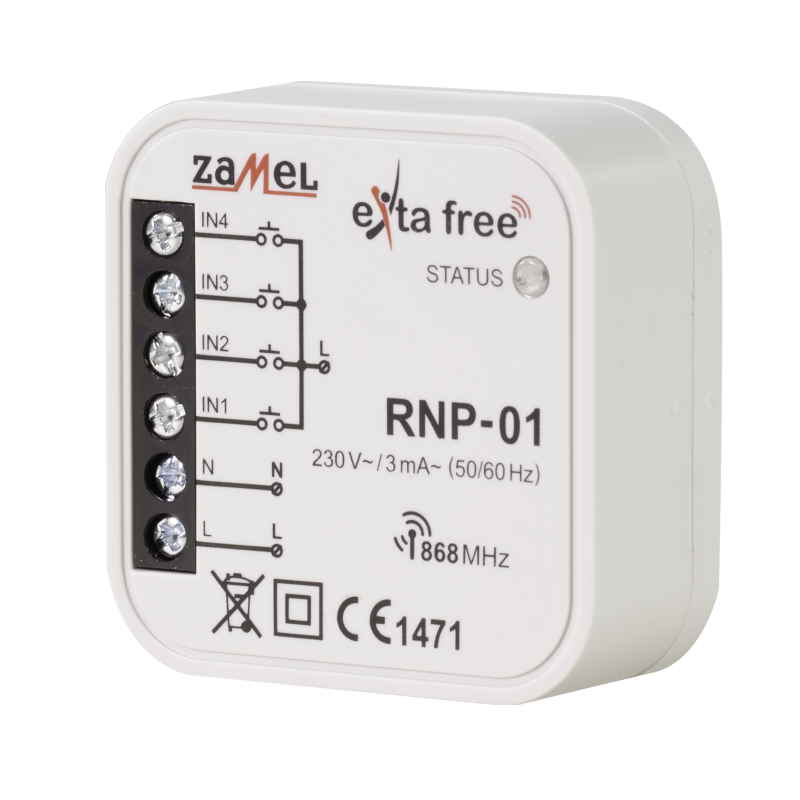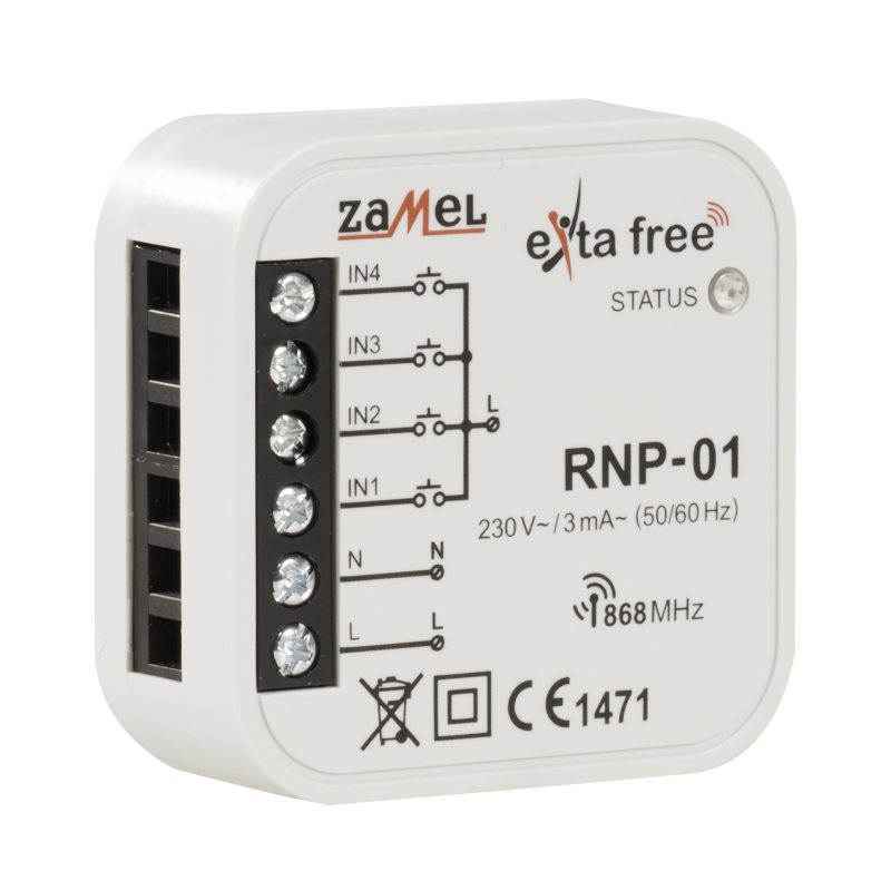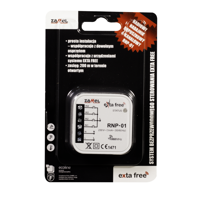 4-kanałowy dopuszkowy nadajnik radiowy firmy Zamel. Nadajnik ten jest nowoczesnym rozwiązaniem w kwestii sterowania automatyką domową oraz systemami Exta Free. Umożliwia on realizację funkcji zdalnego sterowania urządzeniami - nadajnik umożliwia sterowanie 4 niezależnymi odbiornikami. Jest przeznaczony do montażu w puszce podtynkowej - pod istniejącym osprzętem. Dzięki temu możliwa jest łatwa instalacja systemu bez konieczności ingerencji w istniejącą instalację elektryczną. Możliwe jest także wykorzystanie osprzętu elektroinstalacyjnego dowolnego producenta, co nie powoduje ograniczeń w zakresie designu i charakteru wnętrz.