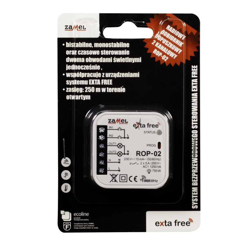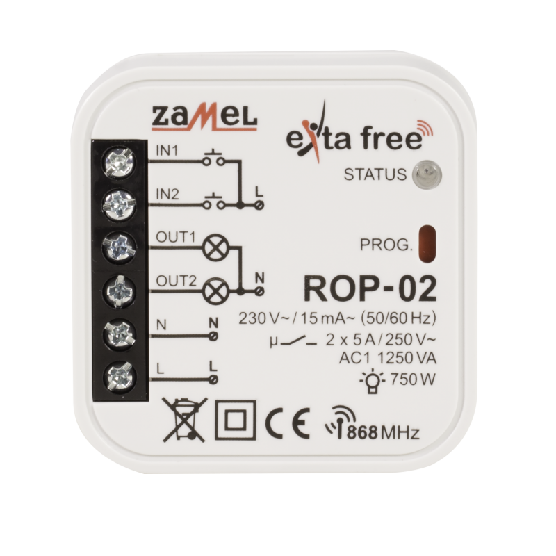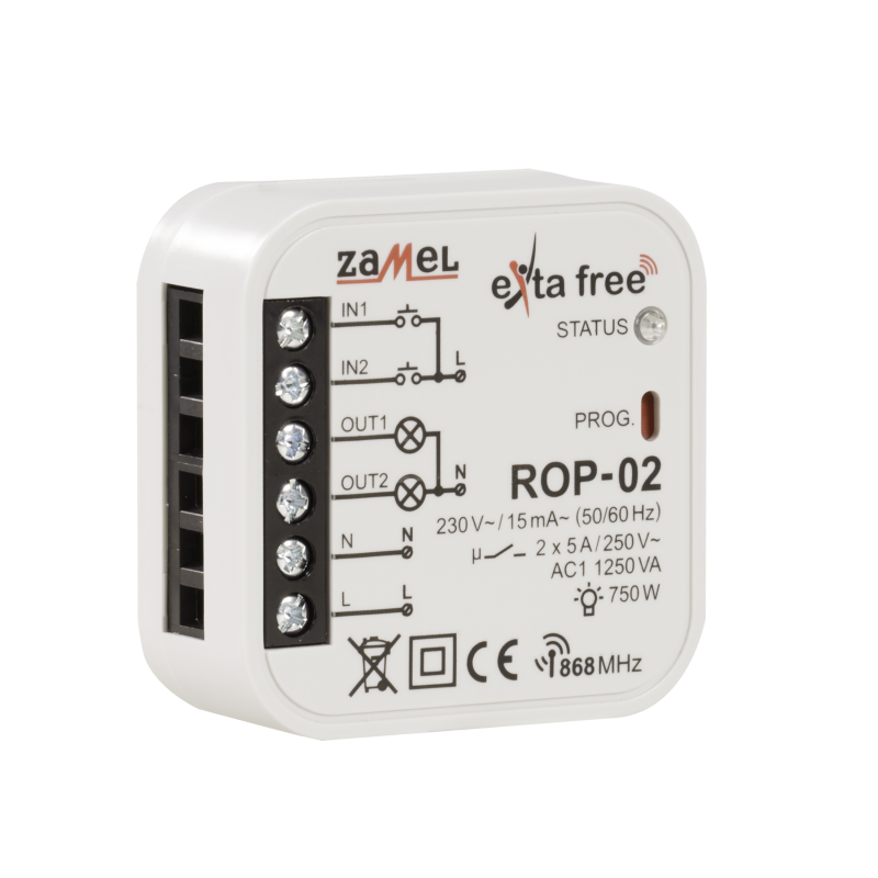 2-kanałowy dopuszkowy odbiornik radiowy firmy Zamel. Nadaje się do montażu zarówno w puszkach instalacyjnych natynkowych, podtynkowych jak i jako urządzenie wykonawcze zabudowane bezpośrednio w obudowach oświetleniowych oraz innych odbiorników. Odbiornik ROP-02 umożliwia pracę w 5 różnych trybach: włączenie, wyłączenie, tryb monostabilny, bistabilny oraz czasowy.