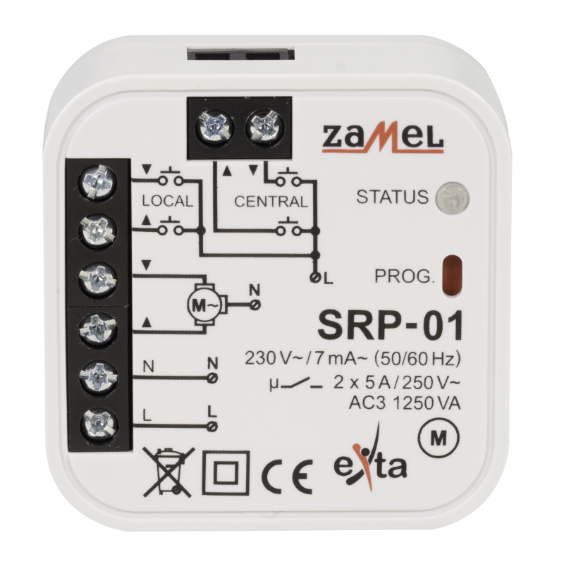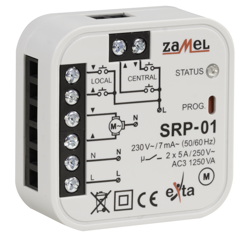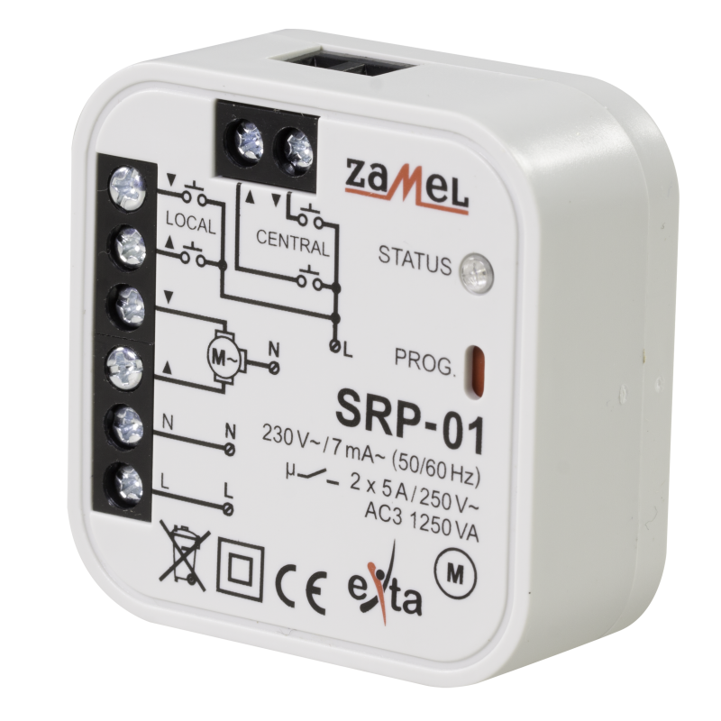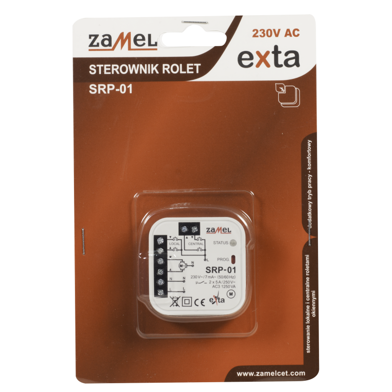 Dopuszkowy sterownik rolet firmy Zamel. Służy on do lokalnego i centralnego sterowania roletami okiennymi, żaluzjami, zasłonami oraz innymi urządzeniami napędzanymi silnikami jednofazowymi 230 V~. Sterownik może pracować jako niezależny sterownik lub być łączony w sekcje. Dodatkowo urządzenie posiada wbudowane tryby komfortowe - gróny i dolony z mośliwością zapamiętania położenia rolety.