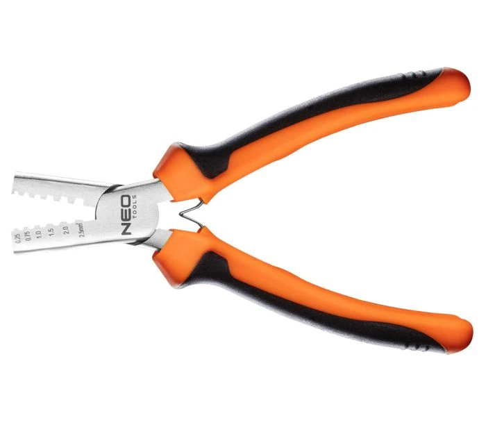 Szczypce do zaciskania końcówek NEO o długości 140 mm. Przeznaczone są do końcówek w zakresie 0,25 - 2,5 mm² (15-9 AWG). Szczęki wykonane z utwardzonej stali węglowej. Dwukomponentowy uchwyt z miękkiego, antypoślizgowego tworzywa PVC podnosi komfort pracy. Blaszki rozpierające ułatwią pracę. Szczypce spełnią wszelkie oczekiwania profesjonalistów.
