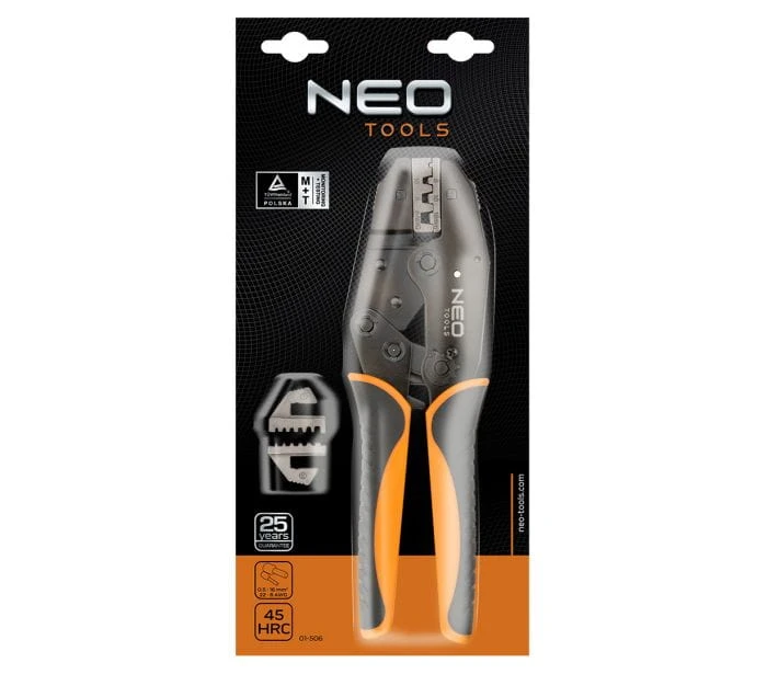 Szczypce do zaciskania końcówek tulejkowych NEO o długości 220 mm marki Neo Tools. Służą do zaciskania końcówek tulejkowych o rozmiarze 0,5 - 16 mm² (22-6 AWG). Posiadają wymienne głowice do zaciskania końcówek nieizolowanych. Głowice zostały wykonane z wytrzymałej stali chromowo-molibdenowej o twardości 45 HRC. Dwumateriałowy i ergonomiczny uchwyt podnosi komfort pracy. Szczypce spełnią wszelkie oczekiwania profesjonalistów.