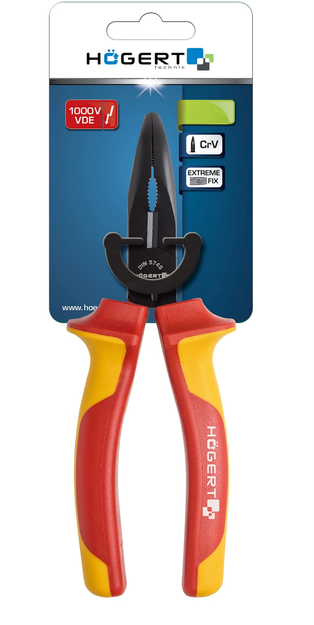 Wydłużone szczypce wygięte firmy Hoegert, służące do kształtowania przewodów oraz drutów. Atestowane do pracy pod napięciem zarówno przy średnich jak i dożych obciążeniach. Szczypce zostały wykonane z wysokogatunkowej stali stopowej chromowo-wanadowej, która jest dodatkowo odporna na odkształcenia. Rozetowe łączenie zwiększa niezadowność i trwałość szczypiec. Dzięki dwukomponentowej oraz izolowanej rękojeści, chwyt oraz operowanie szczypcami staje się dużo wygodniejsze. Rękojeść szczypiec zabezpiecza dłoń przed kontaktem z korpusem.