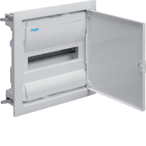 12-modułowa rozdzielnica elektryczna firmy Hager. Rozdzielnica jest przeznaczona do płyt kartonowo-gipsowych. Posiada jeden, 12-modułowy rząd. Rozdzielnica pochodzi z serii Volta - dzięki wbudowanej poziomicy możliwe jest szybkie i skuteczne wypoziomowanie oraz montaż w pełnych ścianach. Rozdzielnice z tej serii posiadają dodatkowo dużą przestrzeń na okablowanie, spory wybór w ofercie wyposażenia zacisków i nowe opatentowane kotwy do ścian kartonowo-gipsowych (w przypadku rozdzielnic do ścian karton-gips).