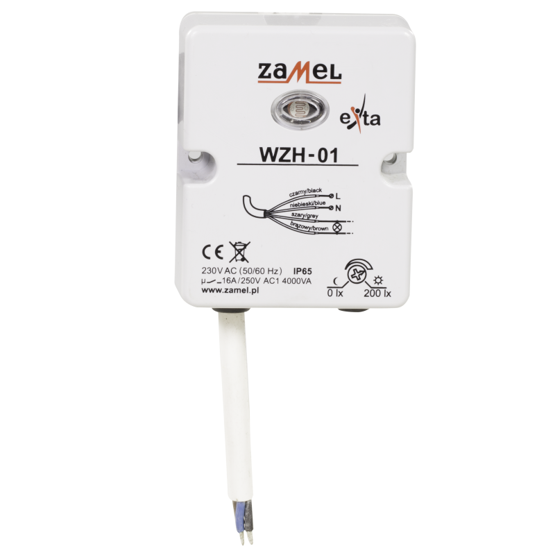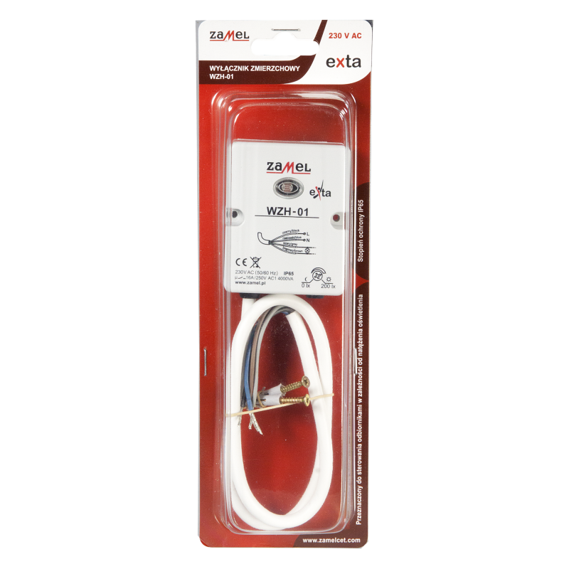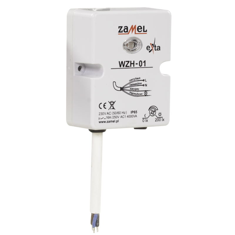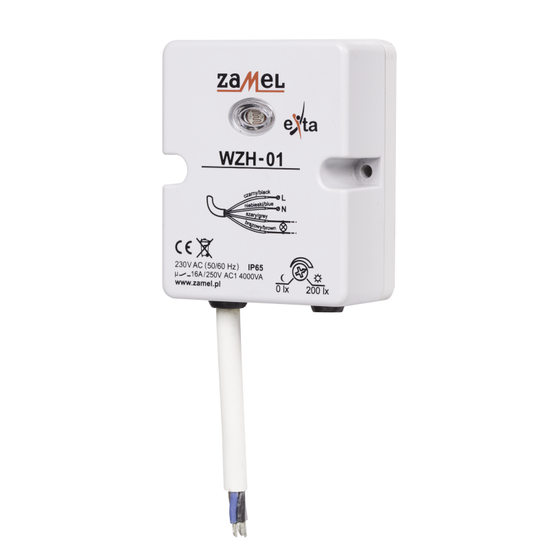 Wyłącznik zmierzchowy z sondą IP65 firmy Zamel. Jest on przeznaczony do sterowania urządzeniami oświetleniowymi bądź innymi odbiornikami energii w zależności od natężenia oświetlenia. Oświetlenie zostaje włączone o zmierzchu a o świcie układ wyłącza oświetlenie. Próg załączenia moży być płynnie nastawiony przez użytkownika. Układ jest odporny na krótkotrwałe zmiany natężenia oświetlenia, dzięki temu jest on niezawodny. A dzięki podwyższonemu stopniu ochrony obudowy, urządzenie może w bezpieczny sposób funkcjonować w niekorzystych warunkach atmosferycznych.