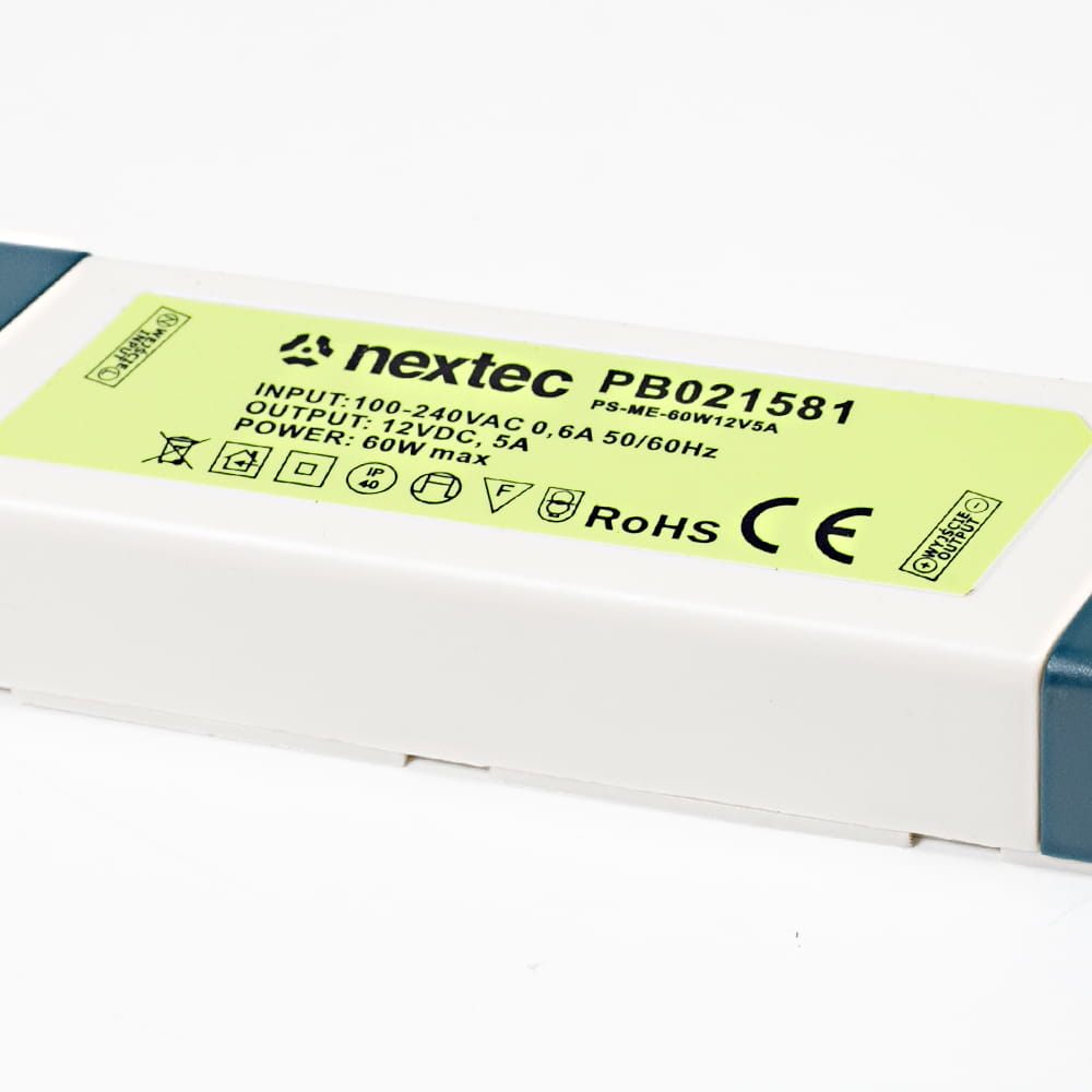 Montażowy zasilacz Economy 12V o mocy 60 W marki Nextec. Wysokiej jakości zasilacz uniwersalny zaprojektowany z myślą o stabilnym zasilaniu i długiej żywotności. Jedną z jego kluczowych cech jest stopień ochrony IP40, który zabezpiecza go przed dostaniem się do środka obiektów o średnicy większej niż 1mm. Funkcje i zalety: