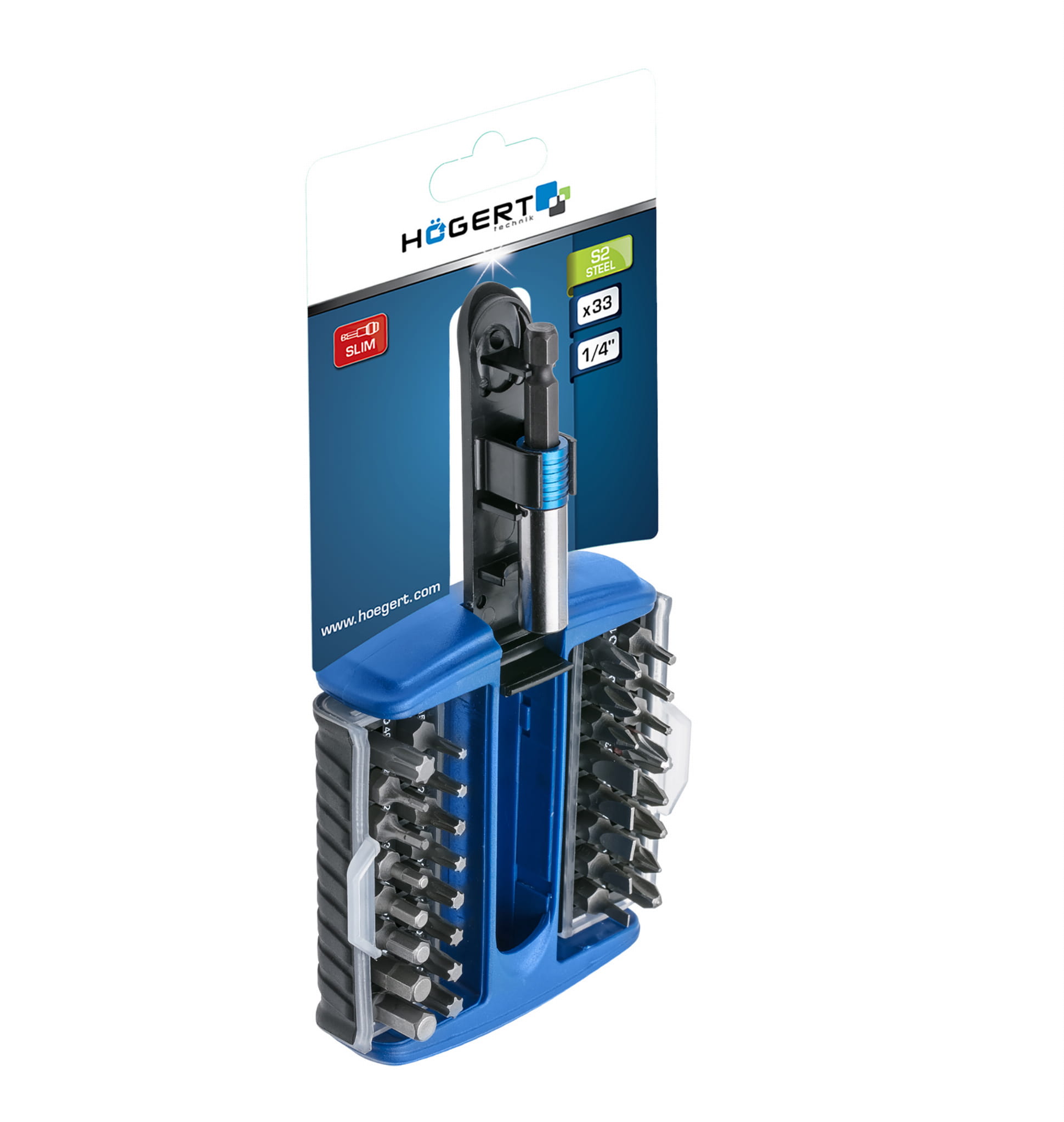 Zestaw wkrętakowych końcówek z wyprofilowanym specjalistycznie uchwytem magnetycznym SLIM 1/4" firmy Hoegert. Zestaw stosuje się w pracach ręcznych oraz z wykorzystaniem elektronarzędzi akumulatorowych. Produkt został wykonany z wysokogatunkowej stali stopowej S2 i jest odporny na odkształcenia. Dzięki wyprofilowanemu uchwytowi magnetycznemu z blokadą końcówki, możliwa jest praca w ciasnych otworach.