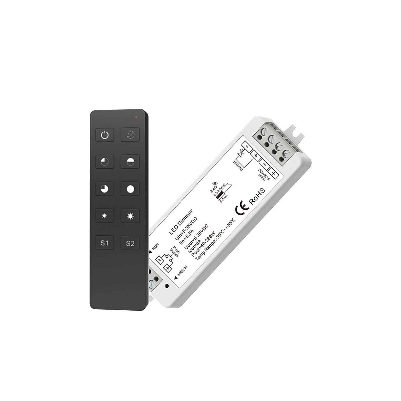 W skład zestawu wchodzi kompatybilny pilot z serii SKY oraz odbiornik o maksymalnym obciążeniu 8A, co pozwala obsługiwać większość popularnych taśm LED jednokolorowych. System wyróżnia się wysoką stabilnością połączenia i szybkim czasem reakcji, dzięki czemu sterowanie oświetleniem jest płynne i komfortowe.